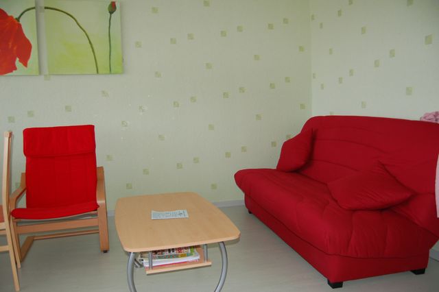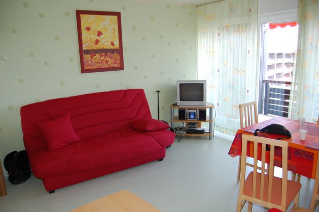 Le salon est doté d'une table avec 6 chaises d'une télé, d'un lecteur dvd, d'une radio ainsi que des 2 clic clac